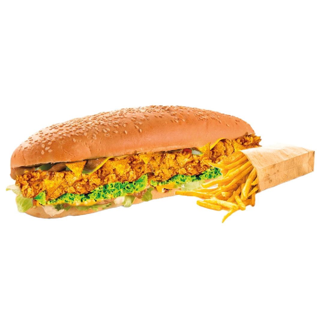 (125 gr tavuk, doritos, marul, mozzarella peyniri, cheddar sos, patates kızartması)